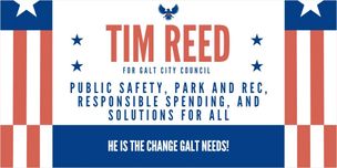 Tim Reed's comprehensive background, combined with his practical experience in managing people, logistics, regulations and budgets make him an excellent choice for Galt City Council.
